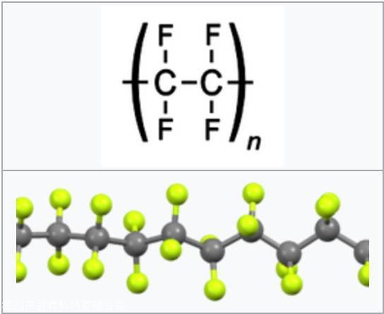 PTFE是由單體四氟乙烯聚合而成,1938年杜邦公司首次發現,廣為人知的PTFE品牌是Teflon®。下圖為PTFE的結構式,黃色小球代表氟原子。