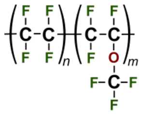 PFA加入了全氟烷氧基,相當于PTFE中的一個氟原子被全氟烷氧基所取代。與PTFE一樣,PFA的配方先由杜邦公司發明,的PFA配方是Teflon PFA。從分子結構上說,PFA的碳鏈相對較短,而鏈纏結的程度更高。下圖所示為PFA的結構式。